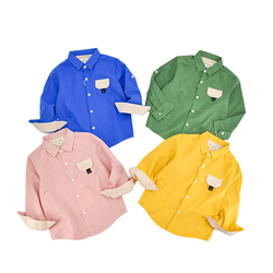 Venta al por mayor de ropa para niños de primavera y otoño Camisa de manga larga de color sólido azul marino y verde con botón marrón